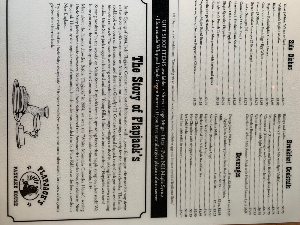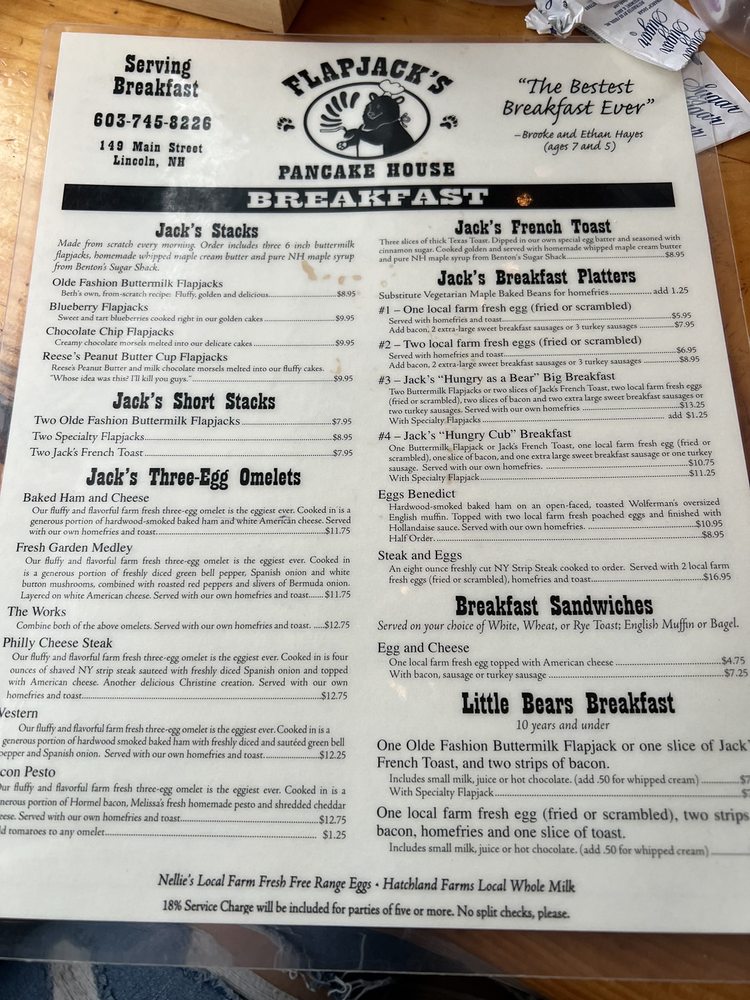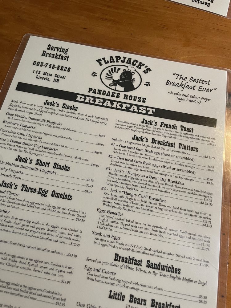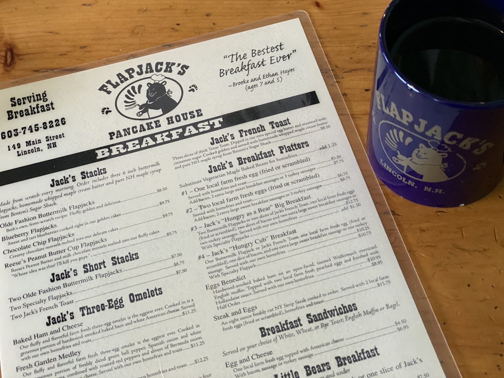 Flapjack's Pancake House, located at 149 Main St in Lincoln, NH, offers a delightful breakfast and brunch experience. With a cozy and casual ambiance, it's a great spot for groups, kids, and even furry friends. The menu boasts many vegetarian options, along with options for those with food allergies. Customers rave about the delicious pancakes, French toast, and unique touches like maple butter. The friendly staff and quick service add to the overall positive experience. While there may be a wait due to the restaurant's popularity, it is well worth it for the tasty food and excellent coffee. With features like outdoor seating and catering options, Flapjack's Pancake House is a must-visit for those in the area.